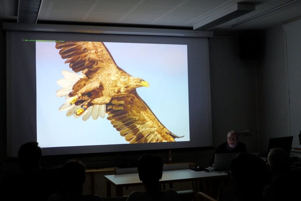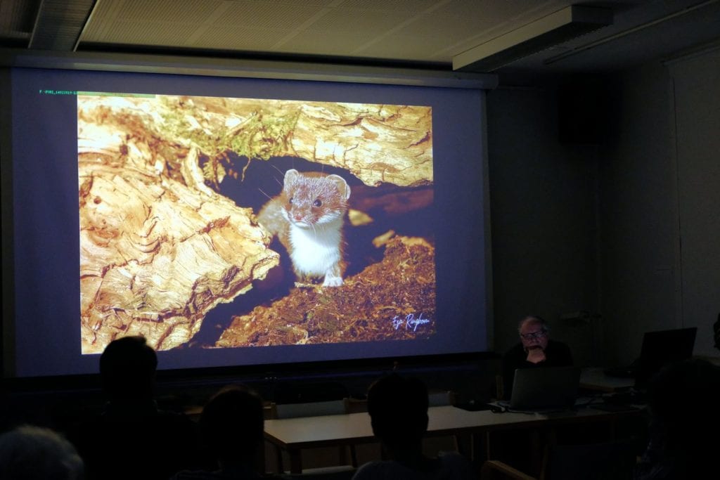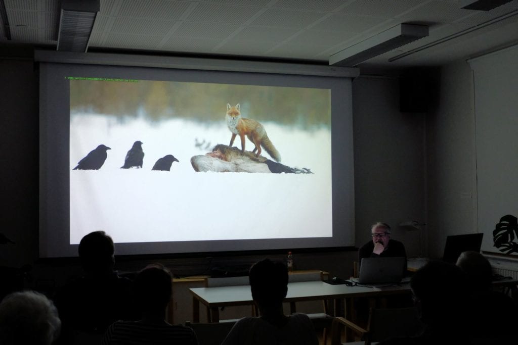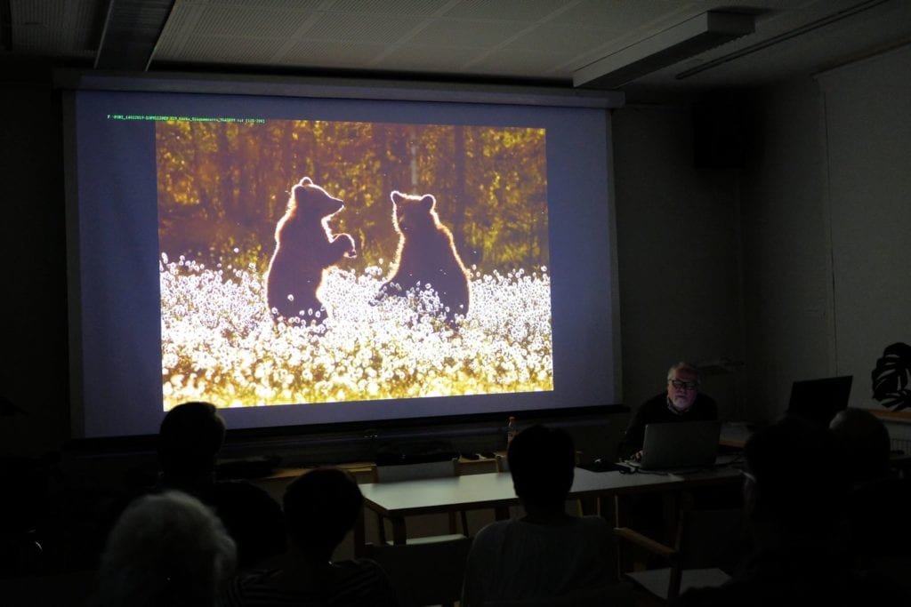 Helmikuun kerhoiltaan kokoonnuttiin hienosti 27 lajiharrastajan voimin, luvussa mukana myös illan luennoitsija, palkittu luontokuvaaja Esa Ringbom (ks https://ring.kuvat.fi/). Esa Ringbom aloitti kerhoiltamme luennoimalla kokemuksistaan luontokuvaajana. Hienossa ja eläväisessä, huumoriakin mukana olleessa esityksessä liikuttiin Pohjois-Norjan Varangin niemimaalla ja Varanginvuonon mahtavissa maisemissa, jossa mukana oli hienoja otoksia alueen eläimistöstä ja linnustosta. Eniten ehkä hämmästyttivät upeat revontulikuvat; ainakin katsojien ihastelevista huokauksista päätellen!Norjan Lapista siirryttiin pikkuhiljaa Suomenkin puolelle ja matka jatkui aivan eteläiseenkin Suomeen. Matkan varrella nähtiin otoksia pikkunisäkkäistä aina karhuihin saakka.Mukaan matkan aikana kameran kennolle tarttuivat niin korpit, ketut ja kotkatkin.Seuraavassa pikkukarhujen tanssahtelua…Mielenkiintoisen esitelmän lopussa kotka laskeutuu…Porin Kameraseura kiittää Esa Ringbomia hienosta ja mielenkiintoisesta sekä varsin asiantuntevasta esitelmästä!