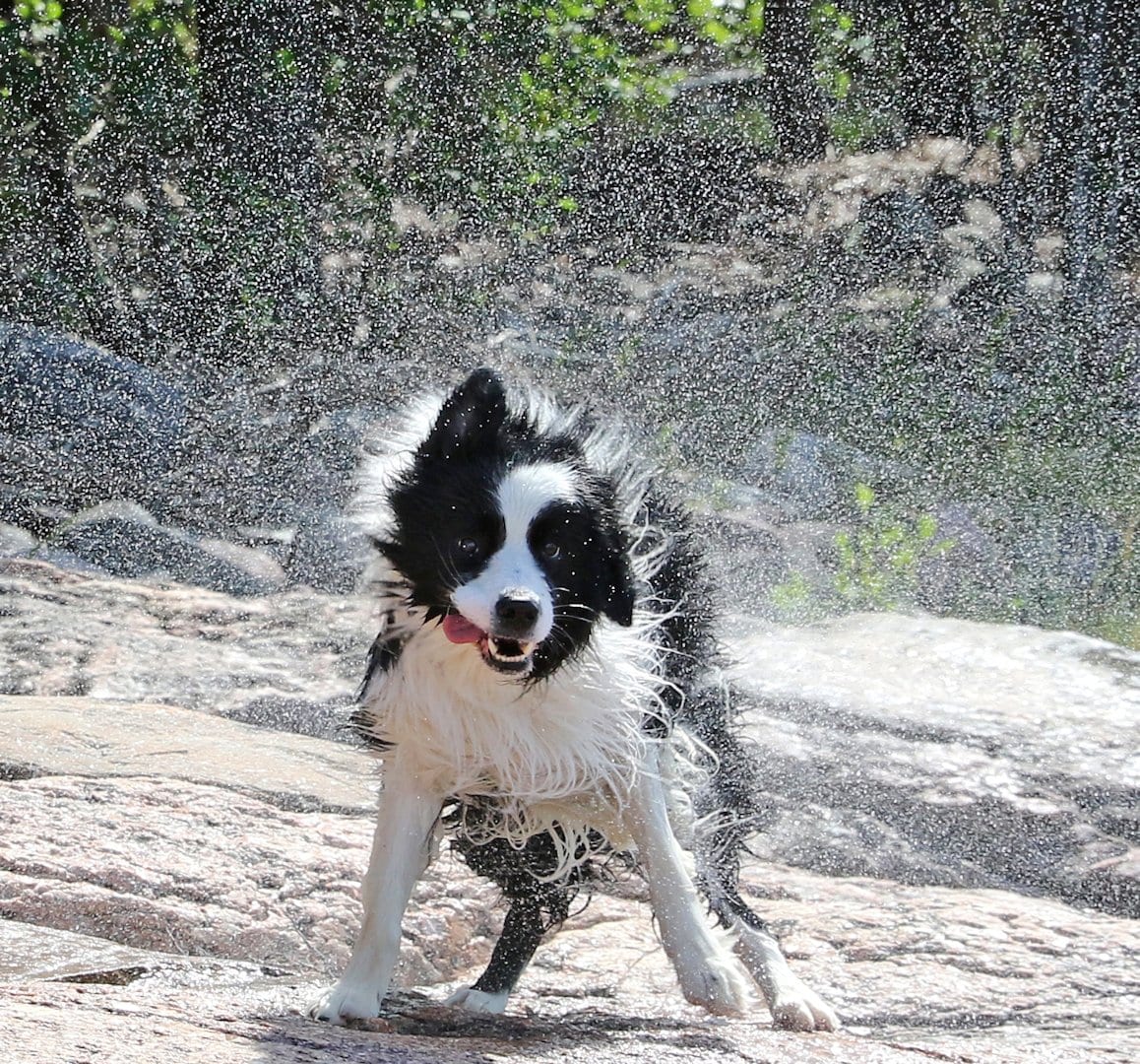 Raadin mietteitä kuvasta:”…vauhdikas ja iloinen kuva; kuvasta ilmenee liike, vaikkei koira juoksekaan; lentävät pisarat tulevat hyvin esille; ilmeikäs koirakuva…”
