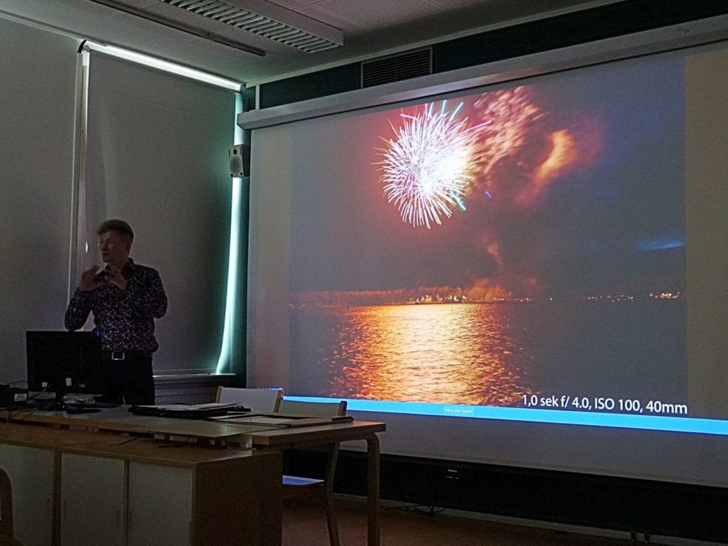 Tiedotusten ja muiden yleisten asioiden jälkeen Petri Hakosalo esitteli “KYMPIN KUVAT” -osiossa kuvaamiaan ilotulituskuvia. Hän kertoi kokeilleensa eri asetuksilla ilotulitusten kuvaamista erilaisissa olosuhteissa ja paikoissa.Kuva E-MV)
